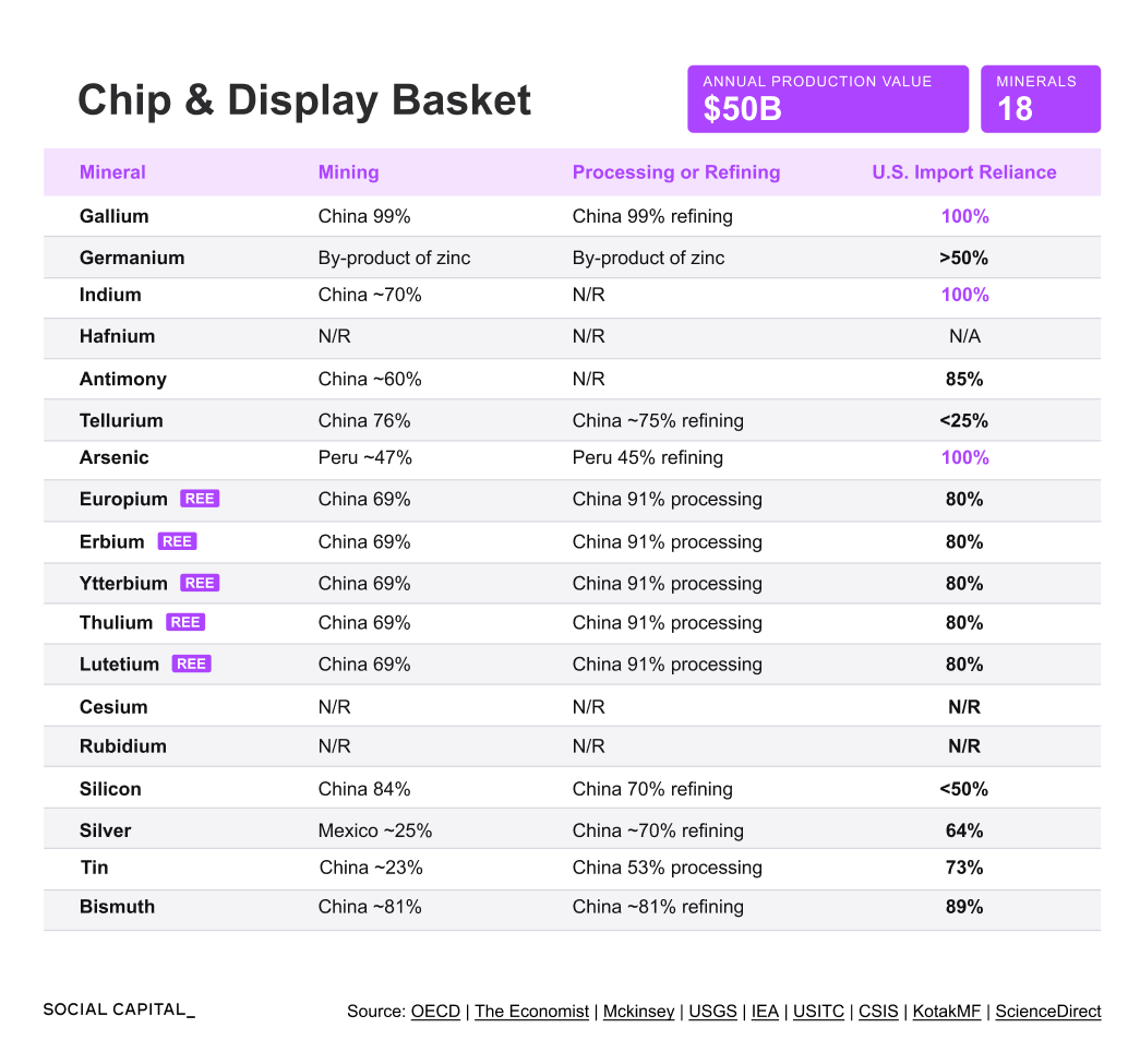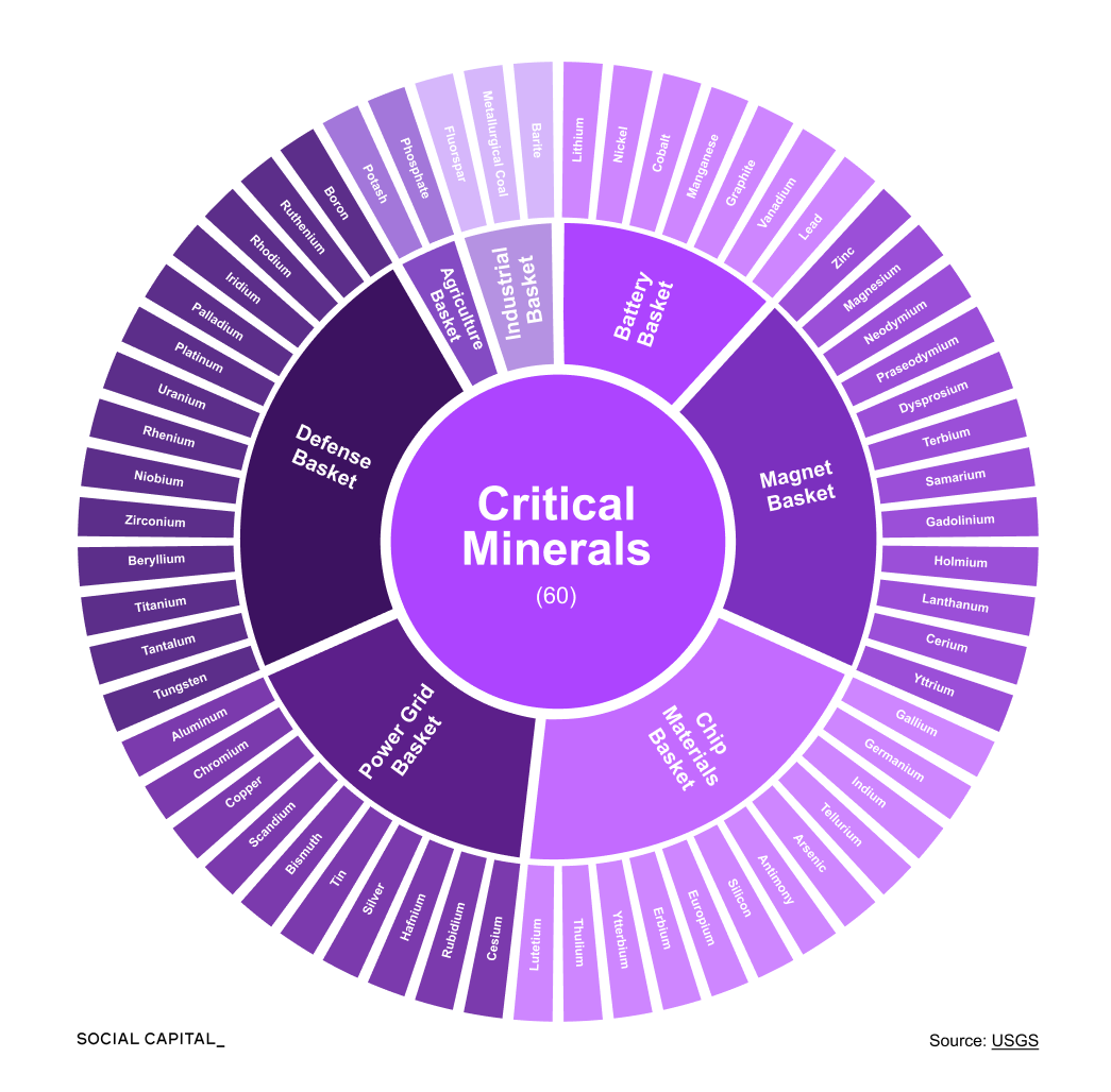 The 60 U.S.-designated critical minerals underpin industries worth hundreds of billions across seven baskets: batteries, power grid, magnets, chips and displays, defense, agriculture, and industrial.