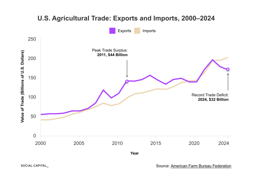 In 2024, the US agricultural trade surplus flipped into a $32 billion deficit.