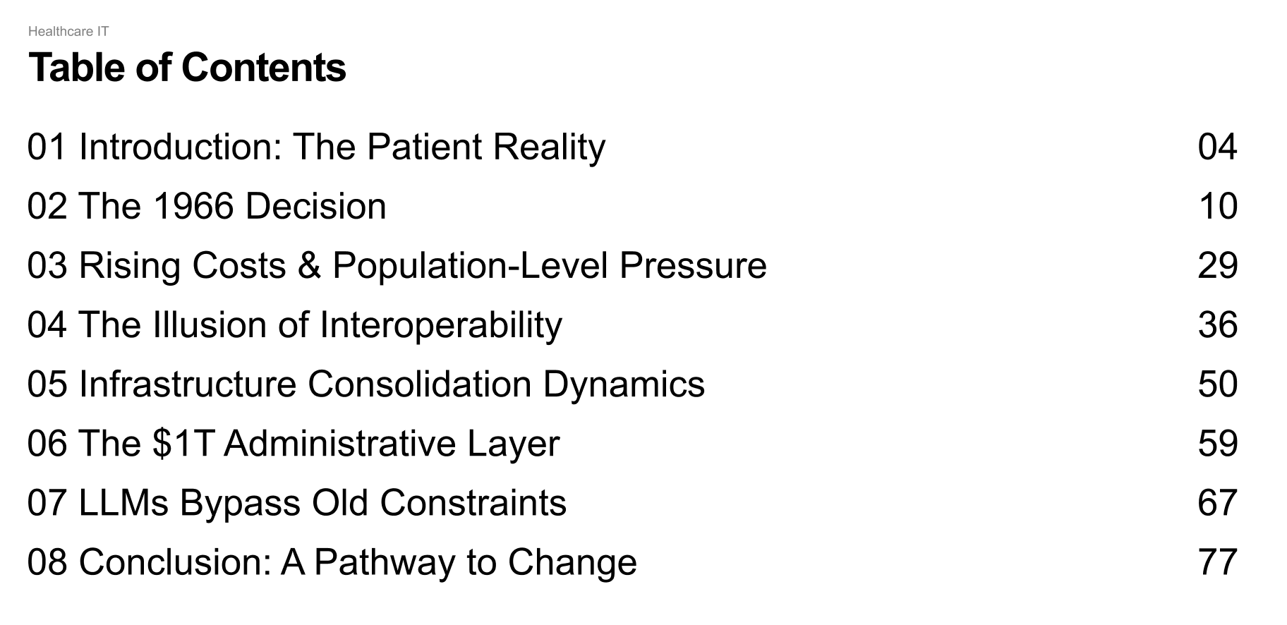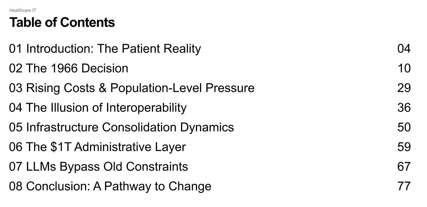 Previous reforms either required the underlying architecture to be rebuilt, vendors to cooperate, or institutions to share data on new terms. LLMs create a new possibility for change by enabling the interpretation of unstructured clinical language on top of the existing infrastructure. This is a major distinction, and it makes this sector worth studying now.
