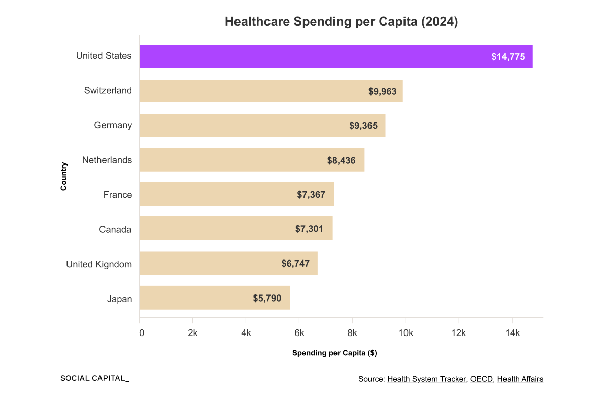 The U.S. spends roughly $1 trillion each year on healthcare administration, representing 25 to 30% of total healthcare spending and about 3.5x as much per capita as Canada.