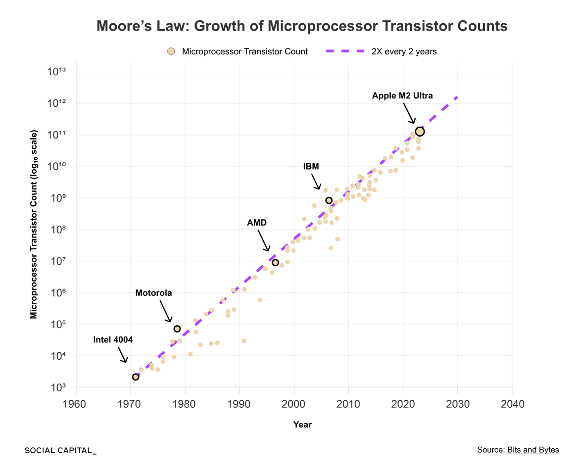 For a long time, progress came from shrinking those transistors. Smaller transistors mean more transistors per chip, increasing computing power, shrinking form factor, and lowering costs. That trend drove steady gains in capability and performance across all computing.