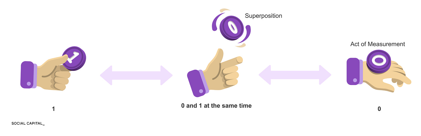 One of those behaviors is superposition. In classical computing, a bit is either 0 or 1. In quantum computing, a quantum bit, or qubit, can exist in a superposition of both states at the same time.