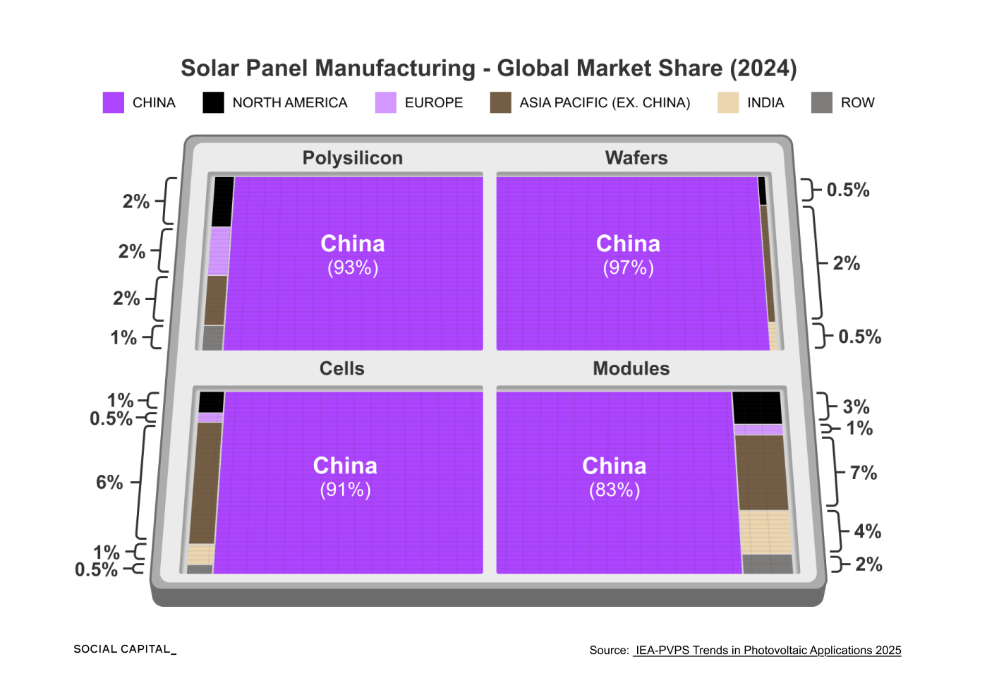 China dominates the solar manufacturing supply chain. Across polysilicon, wafers, cells, and finished modules, Chinese firms control the majority of global capacity. China accounts for roughly 80-95% of production. No other major energy technology has ever been this geographically concentrated.