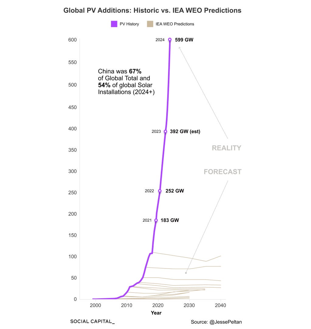 While the International Energy Agency spent the last two decades underestimating solar growth, costs have fallen by 90%, and annual installations have grown exponentially.