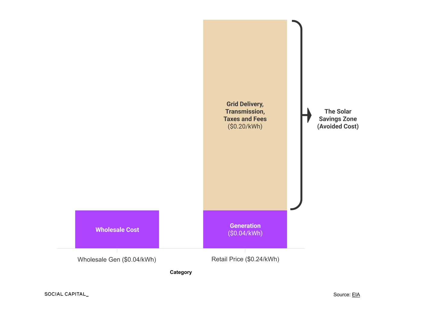 Distributed solar bypasses that system entirely. Electricity is generated where it is consumed. The homeowner captures the avoided grid costs directly.