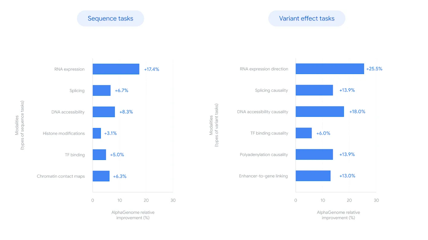 In testing, AlphaGenome outperformed existing models in 24 out of 26 evaluations. This includes gene expression, splicing, and how mutations lead to rare diseases or cancer. For example, it successfully traced how specific non-coding mutations trigger T-cell leukemia, revealing the mechanism of cancer-associated mutations.