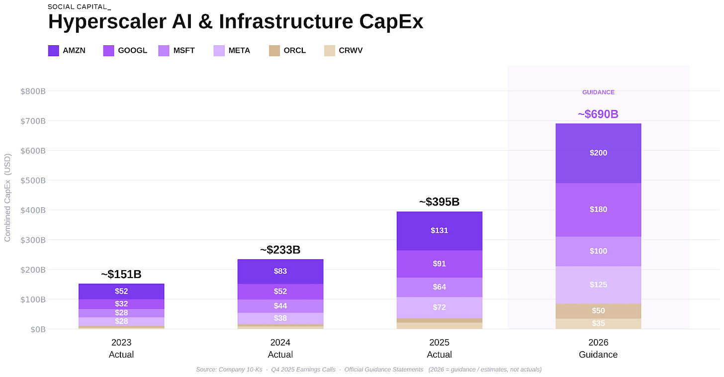 This partnership lands inside Meta’s newly raised 2026 capex outlook of $115–$135B, up roughly 75% from 2025, and is almost entirely focused on its Superintelligence Labs efforts. Zooming out, the infrastructure race is still going strong, with multiple hyperscalers raising their 2026 capex guidance.