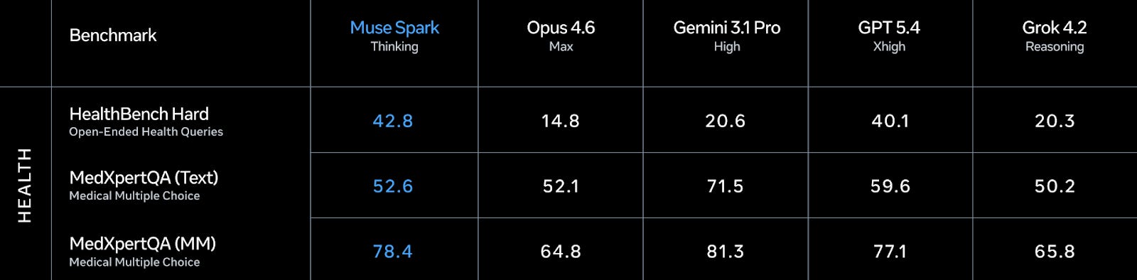 Muse Spark performs competitively in multimodal perception, reasoning, health, and agentic tasks. For healthcare, Meta collaborated with 1,000 physicians to build Muse Spark’s clinical capabilities.