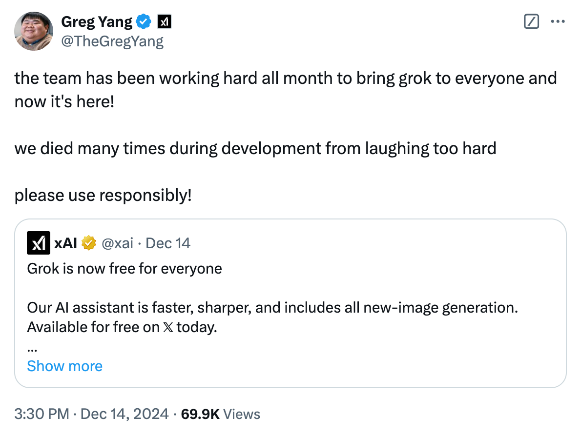 xAI recently released an updated version of Grok-2, making it available to all X users. Among its new features, Grok can now draw information from both X posts and the broader internet, providing answers with citations that users can explore for deeper context. The model's integration with X's platform gives it access to a massive continuous stream of real-time, proprietary data - encompassing text, images, audio, and human interactions from across the platform. Grok's direct access to this data could provide a competitive advantage that compounds over time. Through Reinforcement Learning from Human Feedback and its integration with X's platform, Grok's access to proprietary data could make it the most contextually aware and up-to-date AI chatbot available.