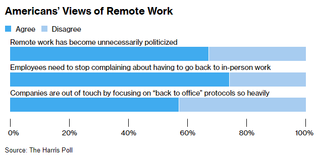 The debate over working remotely has turned ugly as companies call employees back to the office and workers resist the loss of a popular perk. Two thirds of the U.S. thinks that the subject has become unnecessarily politicized, and 74% believe that employees need to stop complaining about having to go back in office. Meanwhile, most people see companies as out of touch for focusing so heavily on “back to office” protocols.