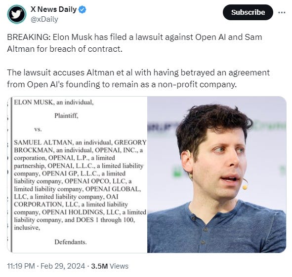 Elon Musk Sues OpenAI for Abandoning its Mission to Benefit Humanity (The Verge)