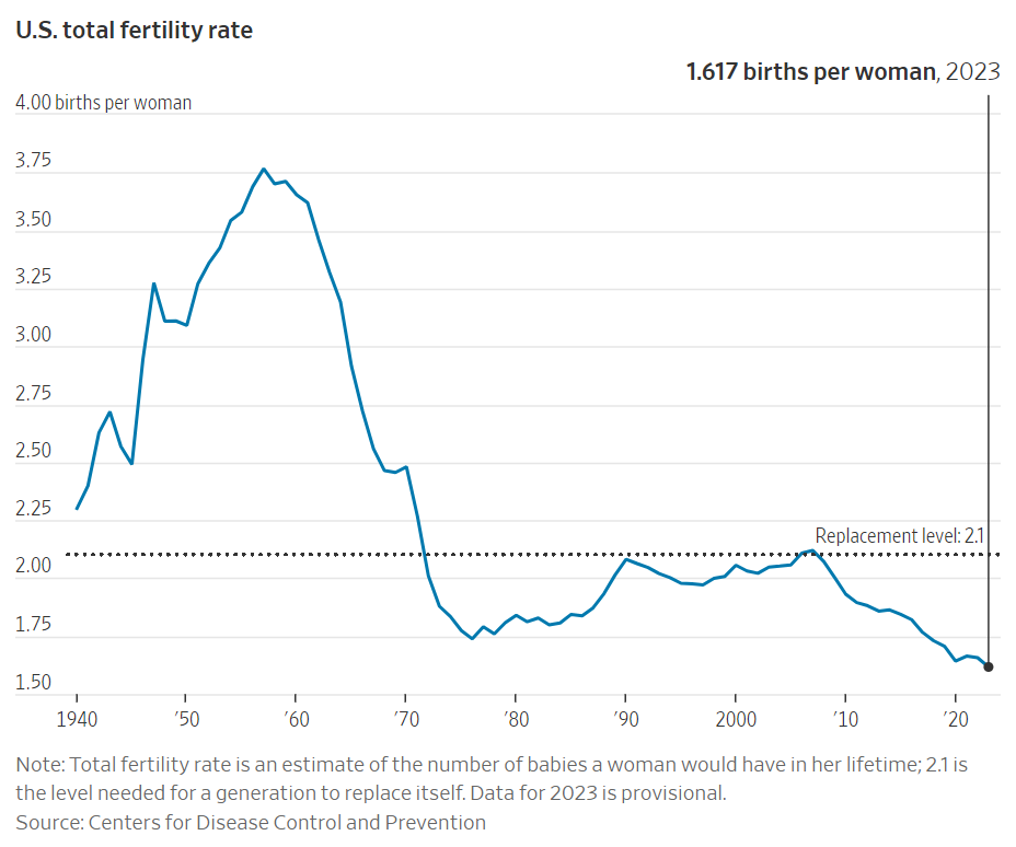 American women are giving birth at record-low rates. The total fertility rate in the U.S. fell to just 1.62 births per woman in 2023, marking the lowest rate recorded since the 1930s when the government first began tracking this statistic. Women are choosing to have fewer children and have children later in life as they establish fulfilling careers and have more access to contraception. By waiting to have children later, women may be having fewer children than they otherwise would for different reasons including declining fertility.