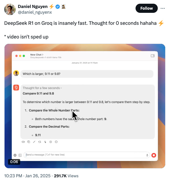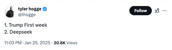 @Chamath Palihapitiya Hey sir amazing post this week. I look forward every week to these! To add on to deep-seek this morning the market has been reacting with a big sell off NVIDA LOST 600B in market cap due to deep seek. And S&P lost 1.9 percent but long term some investors say this could be good for NVIDA. Since lower cost will make AI more reachable to more audiences but to see how the USA tech market reacted to a relatively small Chinese company coming out with this big of product with that low of costs is amazing to see case study wise. Although META and APPLE stocks increased due to this sell off as well. Thank you Chamath for every week informing us!
